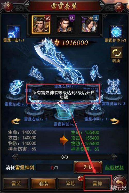 既然是雷霆套装的升级版,那么它的解锁条件显然就没有那么容易了。想要成功解锁【雷神武器】的玩家,关键就在于首先得将你所有的雷霆装备全都升级至Lv3阶段,差一件都不行。要知道,雷霆装备在日常的游戏活动中,其获取方式相对来说都算是比较困难的,更别提像雷霆神剑、雷霆神甲这种超级雷霆装备了。因此,雷神武器的出现无异于给普通玩家设置了一条较高的门槛儿,但如果成功跨了过去,那么能够得到的收益将会是无法想象的!