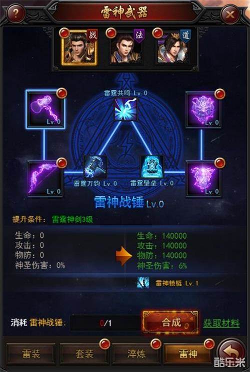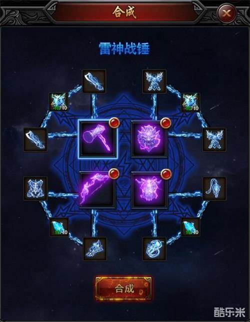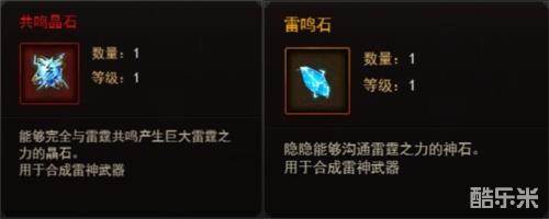 【雷神武器】一共分为雷神战锤、雷神战盾、雷神战弓、雷神战令四种类型,玩家可通过点击图中的合成按键进入到合成界面。每件雷神装备的合成,都需要其对应的两件雷霆装备和媒介作为专属的合成材料,而值得一提的是,雷神战锤、雷神战盾与雷神战弓、雷神战令所需要的合成媒介并不相同,分别为共鸣晶石和雷鸣石,这一点尤其需要注意。