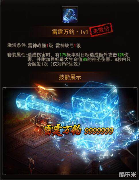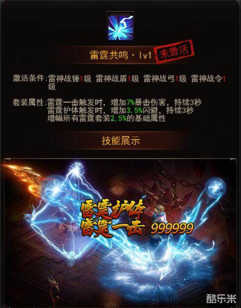 雷霆共鸣Lv1:“雷霆一击”触发时,增加7%暴击伤害,持续3秒;“雷霆护体”触发时,增加3.5%闪避,持续3秒;增幅所有雷霆套装2.5%的基础属性。