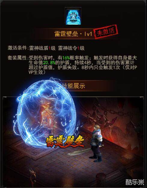 雷霆壁垒Lv1:受到伤害时,有16%概率触发,触发时获得自身最大生命值20.8%的护盾,持续4秒;当受到的伤害累计超过护盾值时,护盾失效。8秒内只会触发1次(仅对PVP生效)